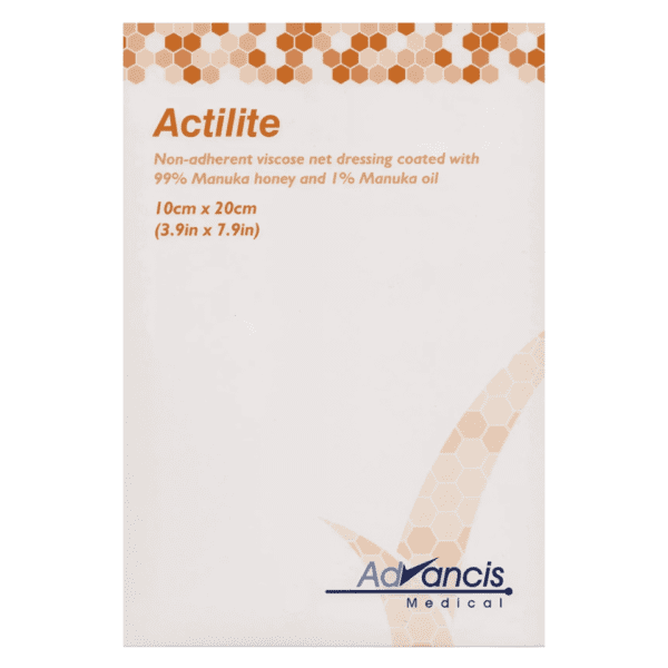Actilite is a light viscose net dressing coated with antibacterial Manuka honey & Manuka oil. The dressing is designed to protect a wound, promote healing and allow the passage of exudate. The antibacterial effect of Actilite has been enhanced by combining high grade antibacterial Manuka oil with Manuka honey. The combination of Manuka honey and Manuka oil has been demonstrated in-vitro to be effective against a number of major wound infecting organisms including MRSA, VRE and Providentia stuartii.