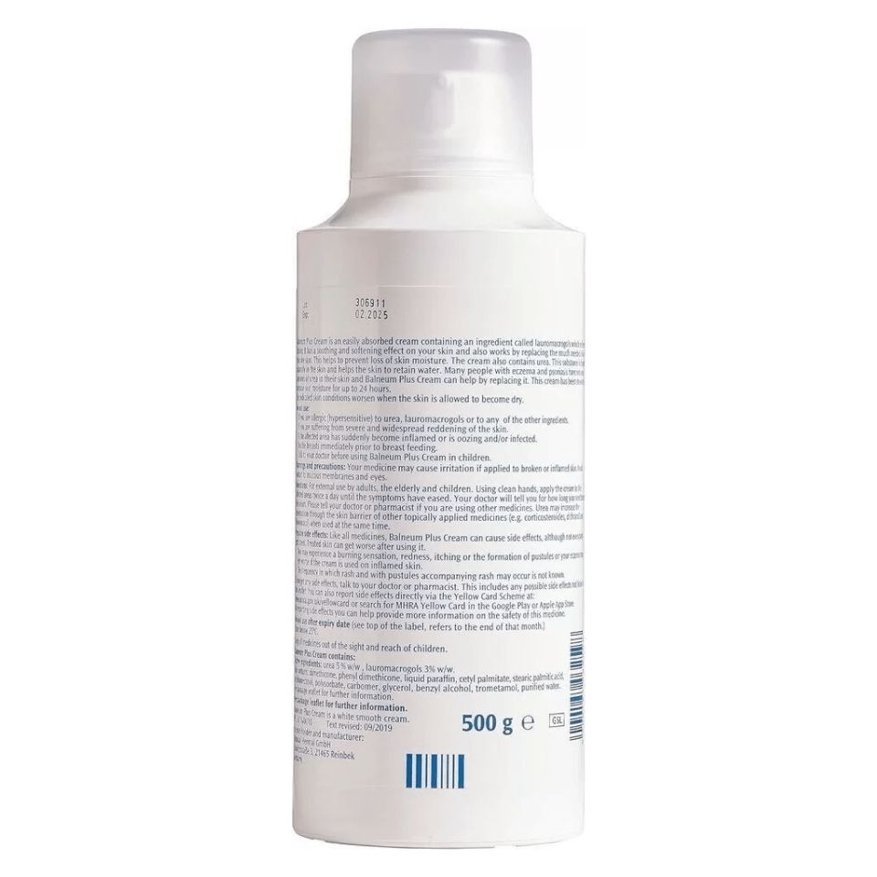 Balneum Plus Cream contains: Lauromacrogols 3.0% w/w, Urea Ph Eur 5.0% w/w as the active ingredientsAlso contain, Phenyl Dimethicone, Liquid Paraffin, Cetylpalmitate, Stearic Palmitic Acid, Octyldodecanol, Polysorbate, Carbomer, Glycerol, Benzyl Alcohol, Trometamol, Purified Water.