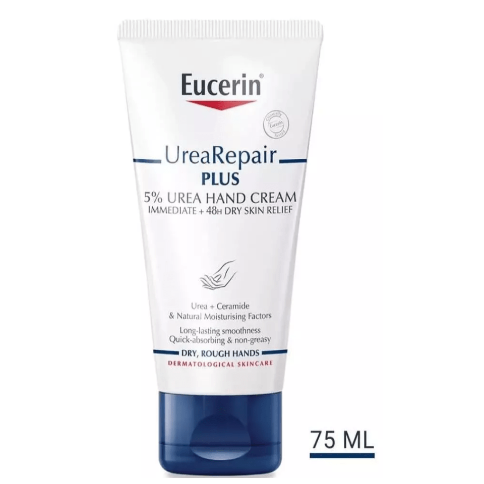 Eucerin Urea Hand Cream Repair Plus 5% Hand Cream provides immediate relief for the symptoms of dry and rough hands, soothing your hands and giving you smoother and softer skin. The natural skin barrier on your hands is constantly affected by the elements. Soaps, water and cold weather will all have an impact on this natural barrier, leading to dehydration, dryness and roughness of skin. The ingredients help to bind moisture in the skin and replace lipids, which are essential to help your skin form and strengthen the natural skin barrier and prevent moisture loss. This hand cream contains naturally occurring moisturising factors (NMFs), along with Urea and Ceramides. This hand cream contains naturally occurring moisturising factors (NMFs), along with Urea and Ceramides. Eucerin Urea hand cream is clinically proven to provide immediate relief for dryness, whilst helping to strengthen the skin’s natural barrier over time for smoother hands.