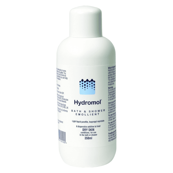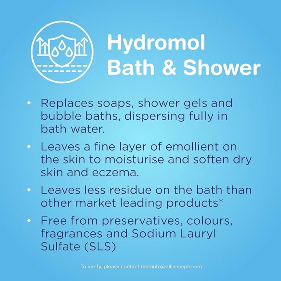 Hydromol Bath & Shower Emollient Cleanses. Moisturises. Softens. Hydromol Bath & Shower Emollient disperses fully in bath water, replacing soap, shower gel and bubble baths. Free from preservatives and fragrances, it moisturises and softens dry skin and eczema. After bathing, less oil is left on the bath surface and more goes down the plughole than other widely prescribed bath emollients Presentation: Colourless liquid containing light liquid paraffin (37.8%) and isopropyl myristate (13%). Indications: For the treatment of dry skin conditions such as eczema, ichthyosis and senile pruritus.