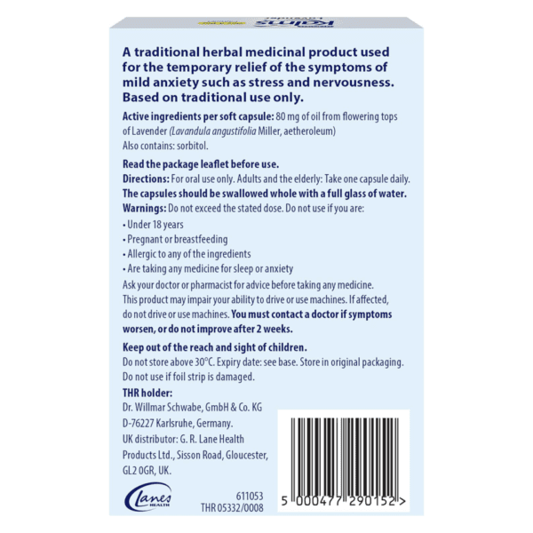 Kalms Lavender One-A-Day Capsules are a traditional herbal medicinal product for the temporary relief of anxiety. Lavender oil has a long standing association with relieving symptoms of mild anxiety such as stress and nervousness. Comes in a convenient one-a-day soft capsule. Oil from flowering tops of Lavender (Lavandula Angustifolia Miller, Aetheroleum), used to relieve mild anxiety, stress & nervousness.