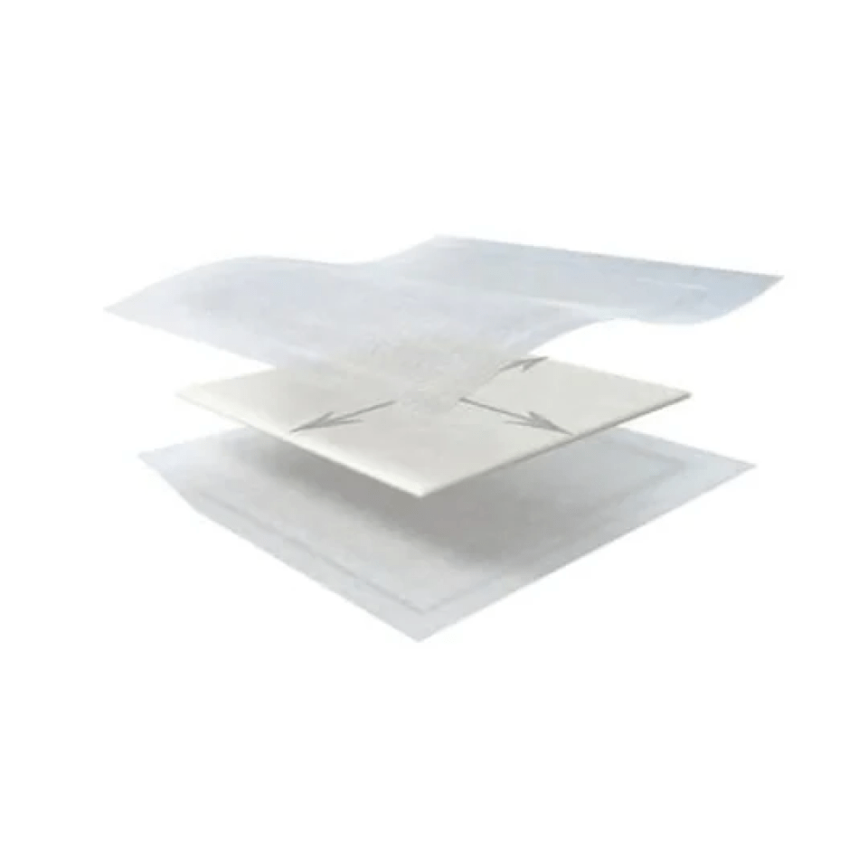 Soft, non-woven material helps to provide improved comfort for the patient along with excellent transpiration. Unique horizontal wicking area effectively increases capacity by distributing exudate throughout the dressing. Super absorbent core locks exudate in so the dressing remains dry to the touch, improving comfort and facilitating faster healing. Heat sealed border prevent leakage from the dressing so that the patient remains clean and comfortable for a longer period.
