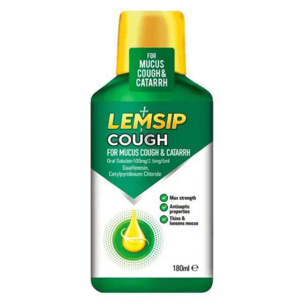 Lemsip Cough for Mucus Cough & Catarrh Oral Solution contains a combination of ingredients which are effective in the symptomatic relief of acute coughs and catarrh associated with influenza, colds and mild throat infections. Guaifenesin (expectorant) allows you to cough up phlegm when suffering from a chesty cough. Cetylpyridinium chloride is an antiseptic which fights against the cause of throat infections.
