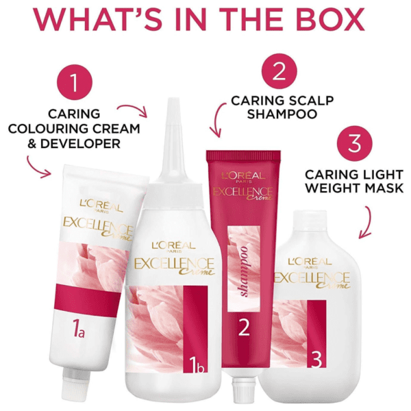Excellence Creme by L’Oreal Paris is a permanent hair dye that provides a rich and long lasting hair colour performance, up to 100% grey hair coverage. The beautifying colour enriches your own natural hair colour and leaves you with a multi-tonal result.