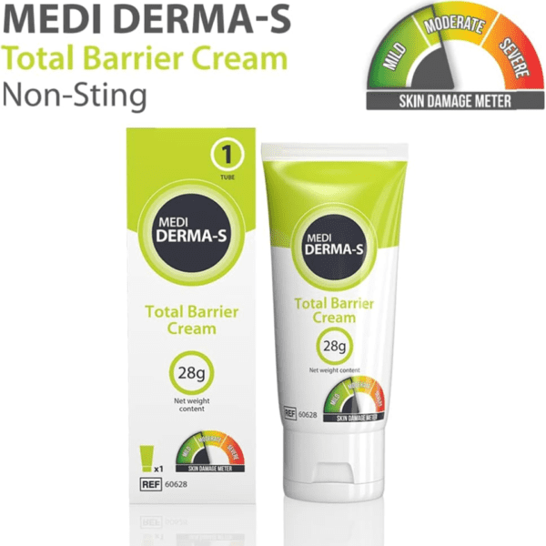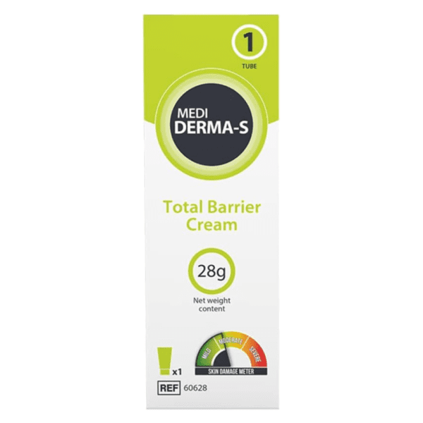 Medi Derma-S Total Barrier Cream 28g Medi Derma-S Barrier Cream provides gentle barrier protection on intact skin or for mild skin damage. Suitable for mild, moderate and severe skin damage. Alcohol, fragrance, parabens, latex and phthalates free. The long-lasting and quick drying formulation provides a protective layer to the skin and is suitable for use during episodes of incontinence. Transparent and quick drying action. Highly moisturising.