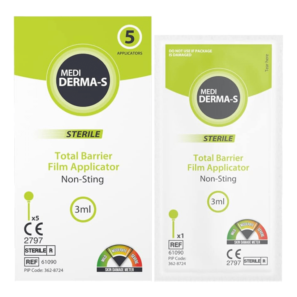 Medi Derma-S Total Barrier Film Applicator 3ml Medi Derma-S Barrier Film provides long lasting barrier protection on mild/moderate skin damage. Medi Derma-S Barrier Film is a silicone-based, long-lasting, non-sting medical grade liquid which forms a protective uniform film when evenly applied to the skin. Its barrier properties protect damaged and intact skin from the harmful effects of moisture, irritants and from potential skin damage that may be caused from the application of adhesive wound dressings or pouches. It is intended for use as a primary barrier against irritation from bodily fluids.