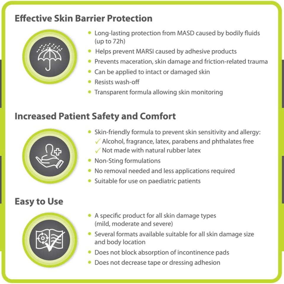• Long Lasting Protection – resilient, hydrophobic protective barrier (up to 72 hours) from moisture associated skin damage(1).