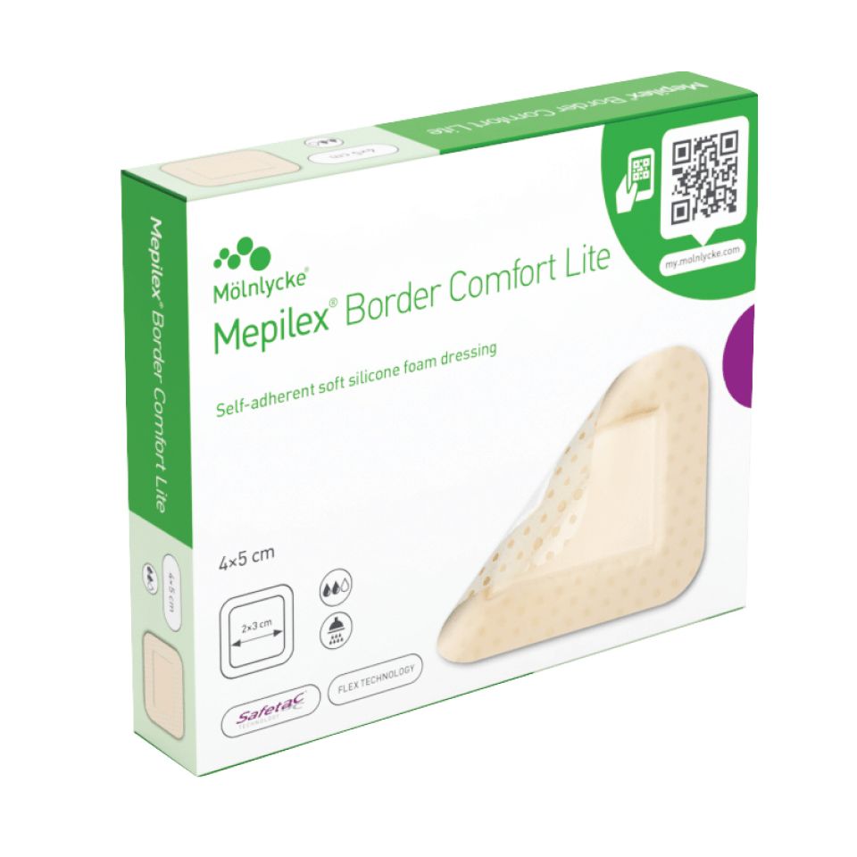 Mepilex Border Comfort / Lite Dressings minimise trauma to the wound and pain to the patient during dressing changes. The Safetac technology prevents Mepilex Border Lite Dressings from sticking to the wound bed yet adheres gently to the surrounding skin. Mepilex Border Lite Dressings are ideal for those locations where a thin self-adherent dressing is required. It is a very conformable and gentle alternative to other thin adhesive bordered dressings. Mepilex Border Lite Dressings are suitable for a wide range of non to low exuding wounds such as: