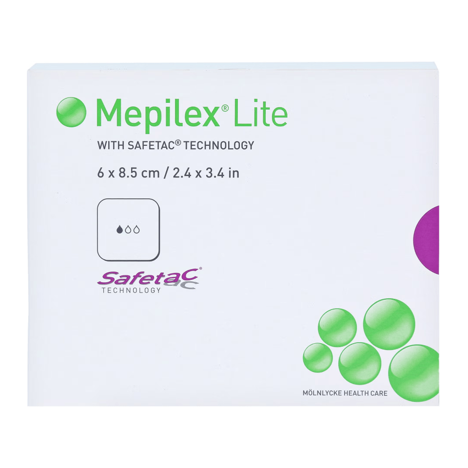 Made from thin foam, Mepilex Lite Dressing is designed to help manage low-exuding acute and chronic wounds. It is conformable and can easily be cut to size making it great for difficult-to-dress areas of the body. This dressing features Safetac technology which is specifically designed to be removed easily without damaging the skin and has been shown to protect fragile skin from external forces, such as friction and pressure resulting from frequent use of medical devices. It also seals the wound margins to protect skin from damaging leakage and maceration.
