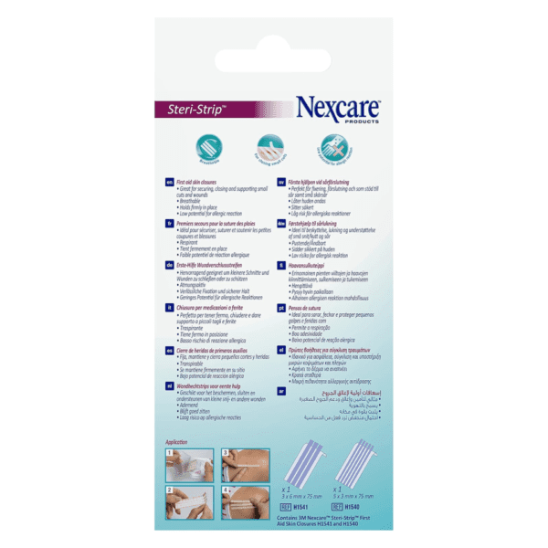Nexcare Steri-Strip’s are hypoallergenic and contain no latex. They are perfect for supporting minor wounds, they have been designed to let the skin breathe when in use and leave minimal residue when removed. Nexcare Steri-Strip’s are widely used in healthcare settings due to their strong yet gentle approach to wound closure.