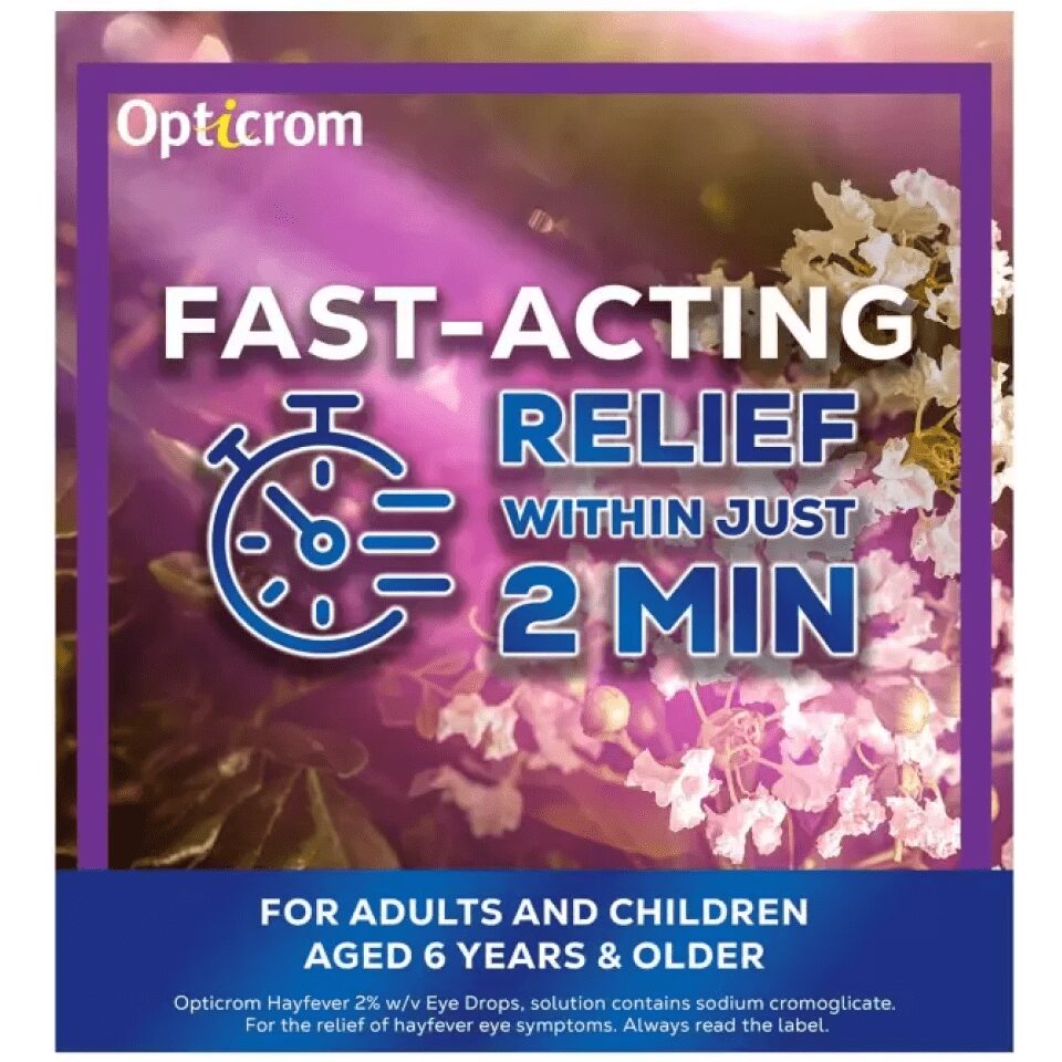 Opticrom Hayfever Eye Drops With Sodium Cromoglicate 2% w/v, Benzalkonium Chloride, Disodium Edetate and Water.