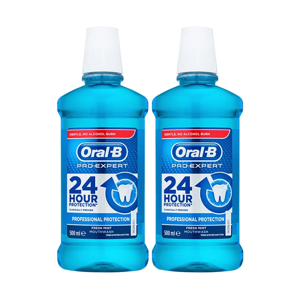 Oral-B Pro-Expert Professional Protection mouthwash is an effective everyday support to reach all areas of the mouth for 24 hours long-lasting plaque protection, when used twice per day. It gives no alcohol burn and has a pleasant fresh mint taste that leaves a sensation of freshness and cleanliness in the mouth. All around 24hrs plaque protection, when used twice a day, Gentle, no alcohol burn, Clinically Proven, Fresh mint flavour. When used in addition to Oral-B Pro-Expert Premium Plaque Control toothpaste and Professional Care electric toothbrush, you will get virtually plaque free mouth in just two weeks. To get one step closer to Professional clean at home, also use with an Oral-B Professional Care electric toothbrush and Oral-B Pro-Expert Toothpaste.