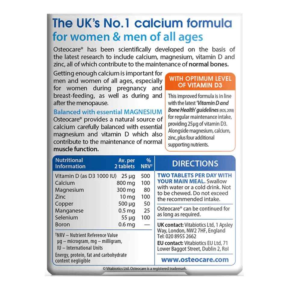 Getting enough calcium is important for men and women of all ages, , as well as during and after menopause especially during pregnancy and breastfeeding. Vitabiotics Osteocare Original is the UK’s no.1 calcium formula and has been scientifically developed on the basis of the very latest research to provide a rich source of calcium and co-factors including vitamin D which helps with the normal absorption of calcium by the body. Vitabiotics Osteocare Original is suitable for vegans too. Vitamin D, Calcium, Magnesium and zinc contribute to the maintenance of normal bones.