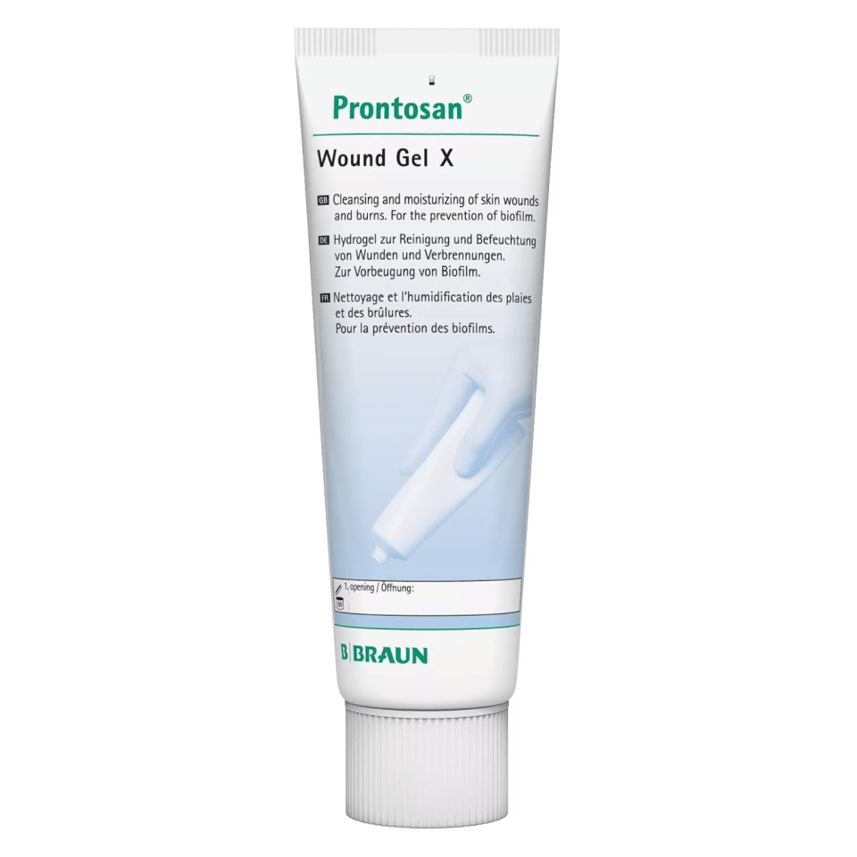 Prontosan gels contain 2 active ingredients, an antimicrobial polyhexanide (polyhexamethylene biguanide [PHMB]), and a betaine surfactant (undecylenamidopropyl betaine). It is indicated for cleansing, rinsing and moistening acute and chronic wounds and to prevent and remove biofilms.Prontosan solution can be used for irrigation, or applied to gauze as a soak. The gels are applied to the wound bed during dressing changes after cleansing.