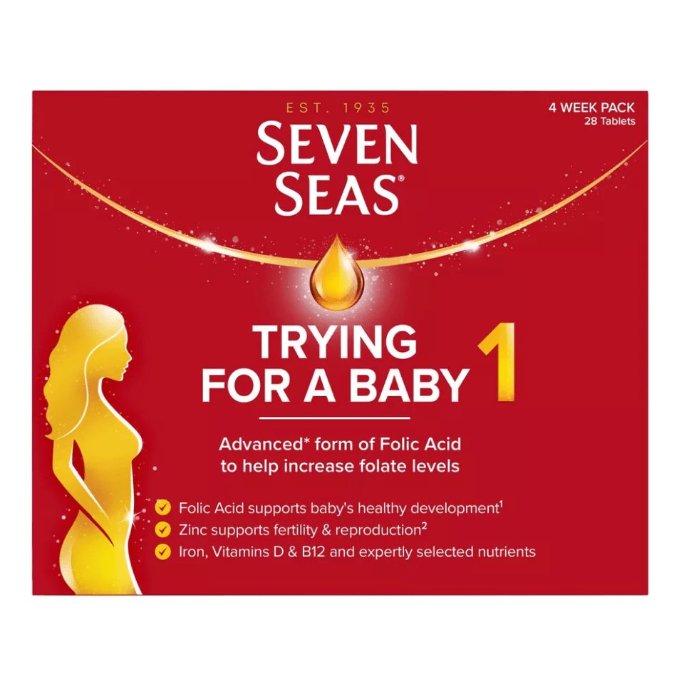 Seven Seas Trying for A Baby Prenatal Vitamins Folic Acid the importance of Folic Acid for pregnancy is well understood by new mums and by Seven Seas. The Department of Health recommends taking a daily supplement of 400μg of Folic Acid when you are trying for a baby and throughout the first 12 weeks of pregnancy. Trying for a Baby mini tablets contain the recommended 400µg of Folic Acid. Folic Acid contributes to normal blood formation and normal maternal tissue growth during Pregnancy1 . Our one-a-day mini tablet contains: − Zinc to support normal fertility4 – Vitamin B6 to help regulate hormonal activity2 – Vitamin D to support normal bones and the normal function of the immune system3 – Plus 5 further selected nutrients Dosage: One mini tablet a day, with food Contents : 28 mini tablets – 4 weeks’ supply – Blister pack with ‘days of the week’ guide Contains Biotin. Box – Recycle Blister – Don’t Recycle ¹ Folic Acid contributes to normal blood formation and normal maternal tissue growth during pregnancy. Pre-Conception Multivitamin for women , containing an array of expertly blended pre-natal vitamins and nutrients formulated for when you are trying to conceive. Food supplements must not replace a balanced diet and healthy lifestyle.