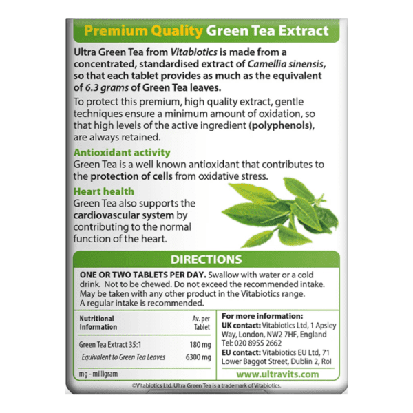 Ultra Green Tea from Vitabiotics provides 180mg of Green Tea extract. Ultra Green Tea is made from a concentrated, standardised extract of Camellia sinensis, so that each tablet provides as much as the equivalent of 6.3g of Green Tea leaves. Ultra Green Tea has been specially formulated with a low, moderate Catechin level (EGCG), so is safe and effective. To protect this premium, high quality extract, gentle techniques ensure a minimum amount of oxidation, so that high levels of the active ingredient (polyphenols), are always retained.
