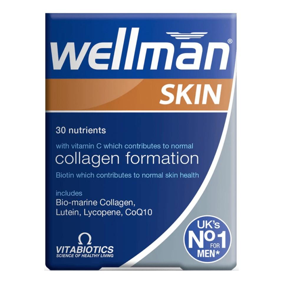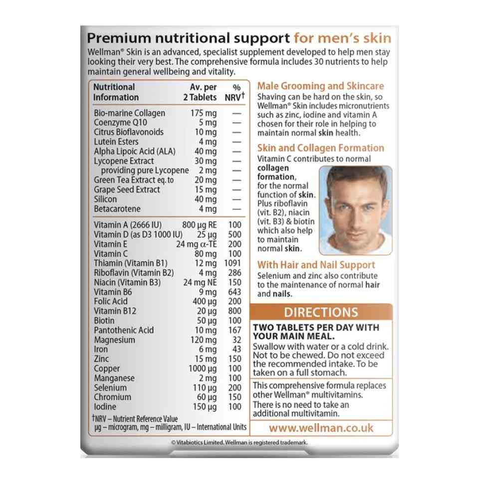 Vitabiotics Wellman Skin is an advanced, specialist supplement, developed to help men stay looking their very best. From the UK’s number 1 men’s supplement brand, Wellman. The advanced skin formula is a major development in male nutrition, with a unique combination of 30 nutrients including biotin which contributes to normal skin health. It also includes bio-active nutrients Biomarine Collagen, Lutein, Lycopene extract and Co-Q10. These nutrients are delivered via the bloodstream at the very deepest level, to the dermal layer of the skin, hair follicles and nail beds. It’s no wonder dermatologists are increasingly looking to the role of nutrition in helping keep skin looking at its best.